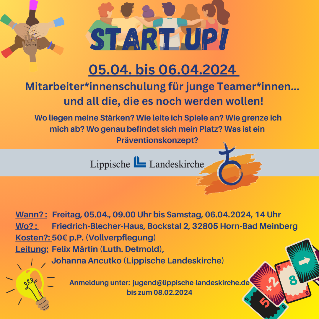 Kreis Lippe. Die Evangelische Jugend Lippe bietet ein „Start Up“ für junge Ehrenamtliche aus lippischen Kirchengemeinden an. Die Schulung kann ab 12 Jahren besucht werden und findet am 5. und 6. April im Friedrich-Blecher-Haus in Horn-Bad Meinberg statt. „Start Up“ ist für alle Jugendlichen relevant, die als Teamer starten und bislang noch keine Ausbildung gemacht haben. Wo liegen meine Stärken, wie leite ich Spiele an, wie grenze ich mich ab, was ist ein Präventionskonzept? Das sind Fragen, um die es geht.