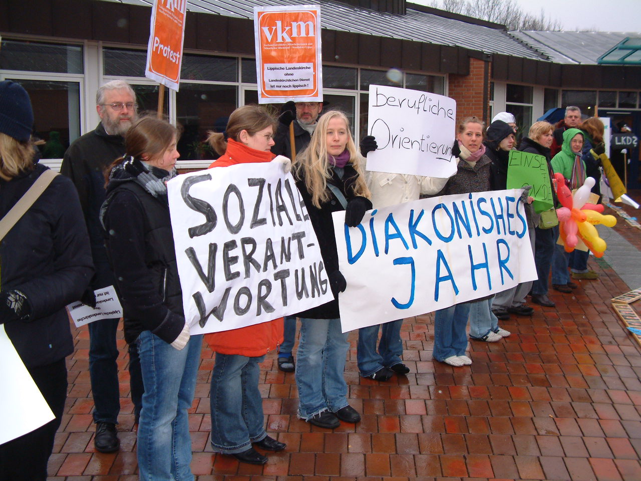 Mit Plakaten und Spruchbändern demonstrierten vor dem Kirchlichen Zentrum Eben-Ezer, in dem die Landessynode tagte, rund 150 überwiegend ehrenamtliche Mitarbeitende gegen die Schließung des LKD.